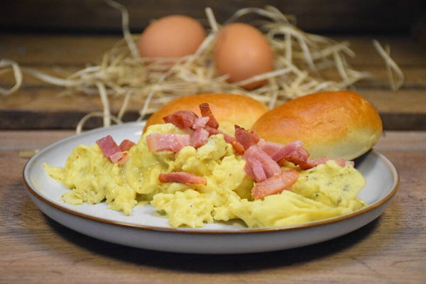 Roerei met spekblokjes voor 2 personen met 4 mini sandwiches.