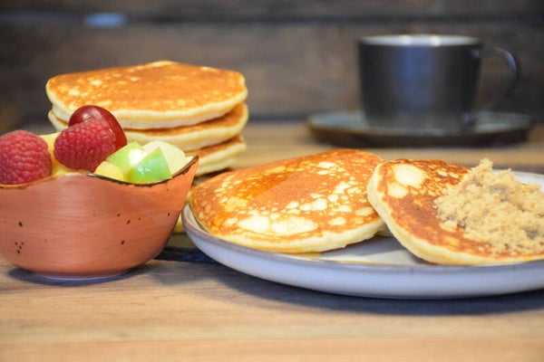8 heerlijke pan cakes met vers fruit, een flesje siroop en kandijsuiker